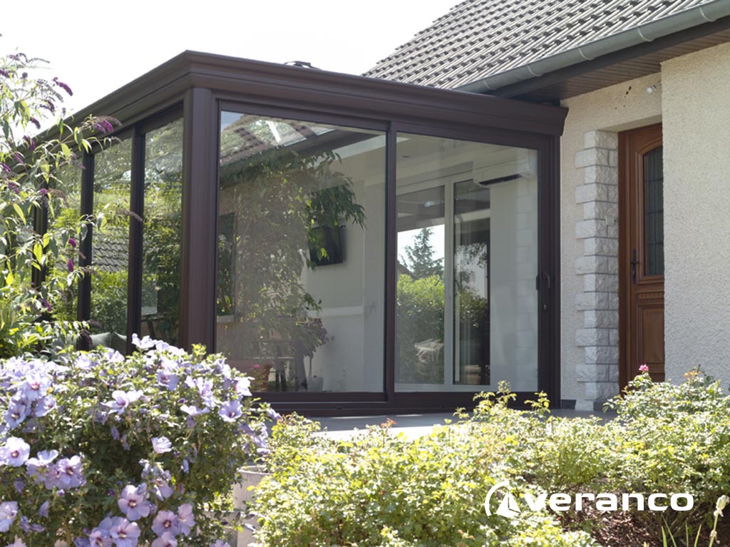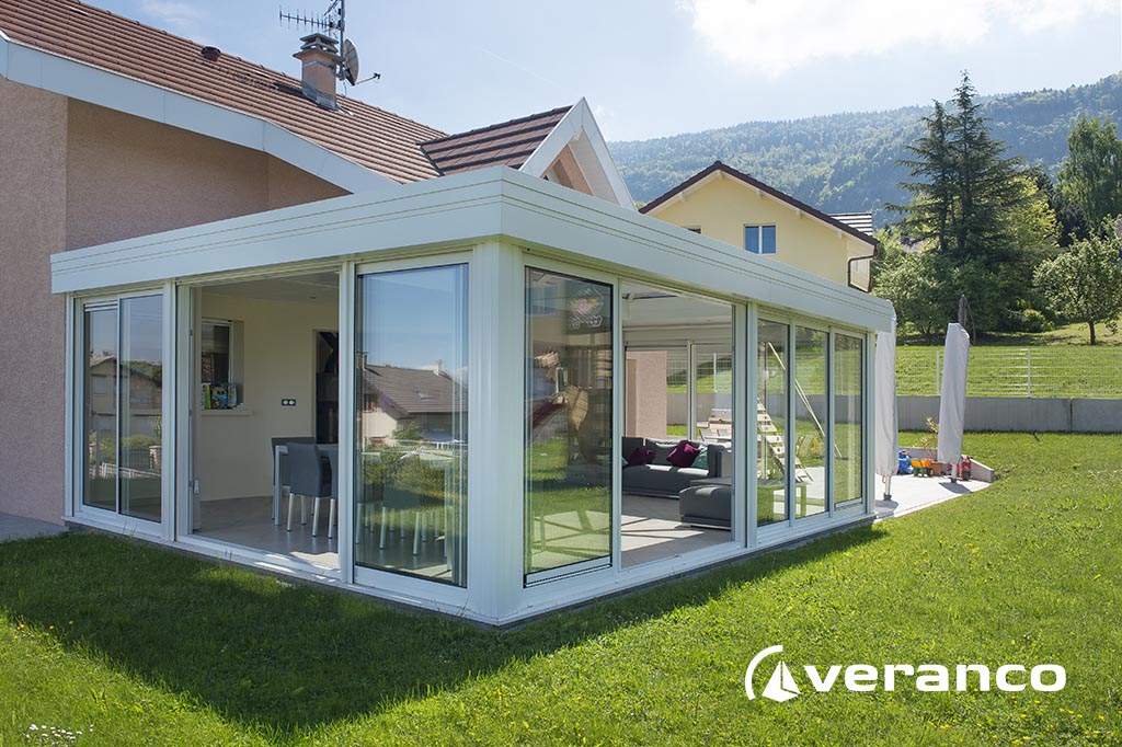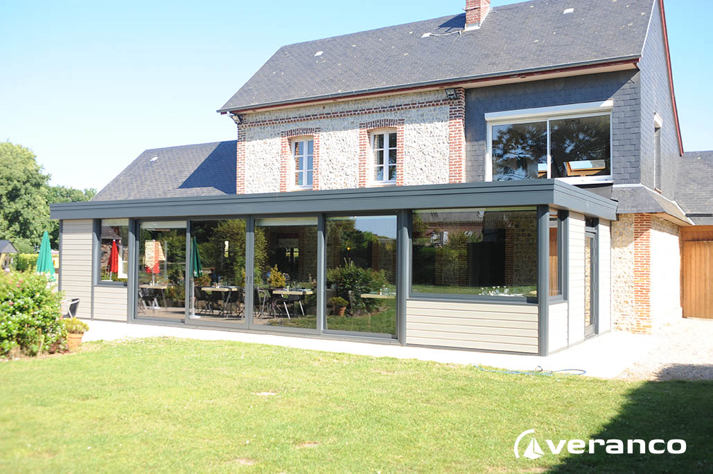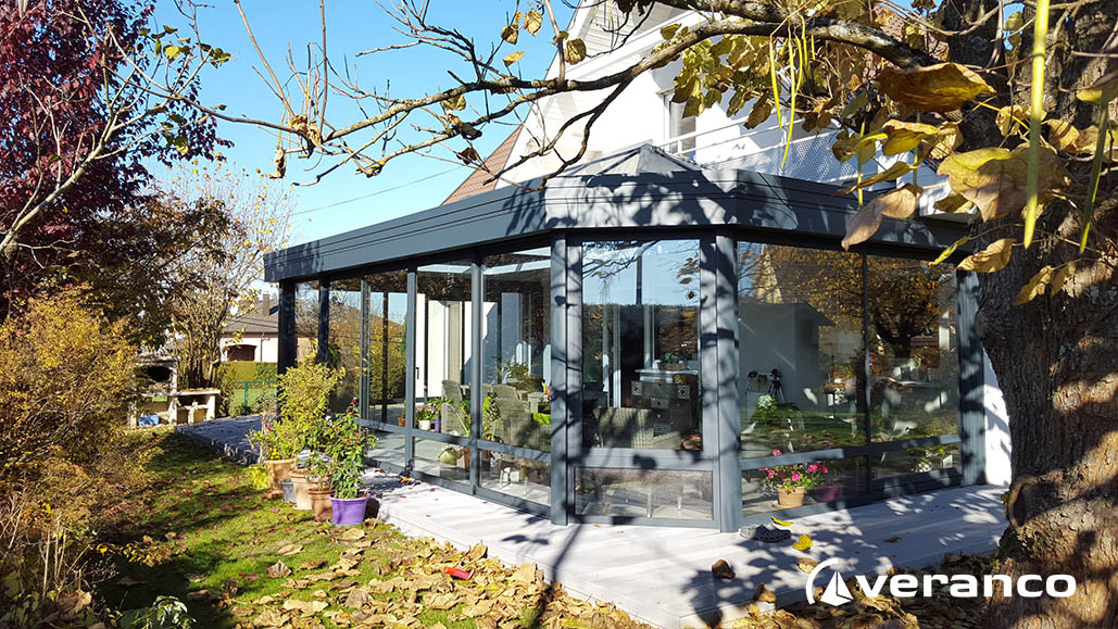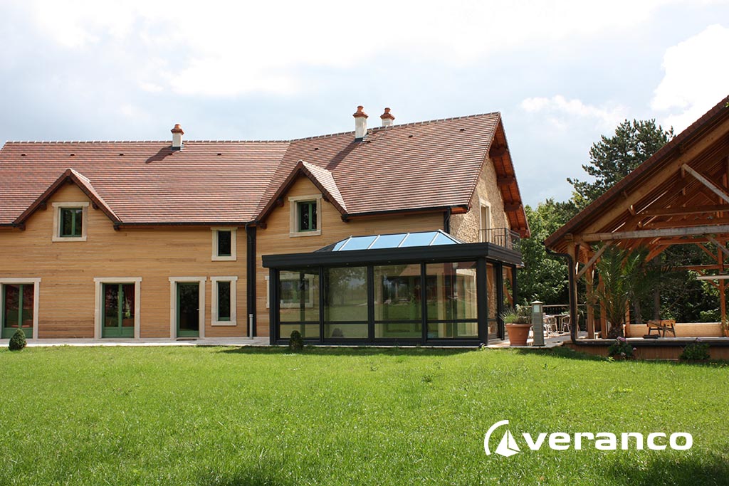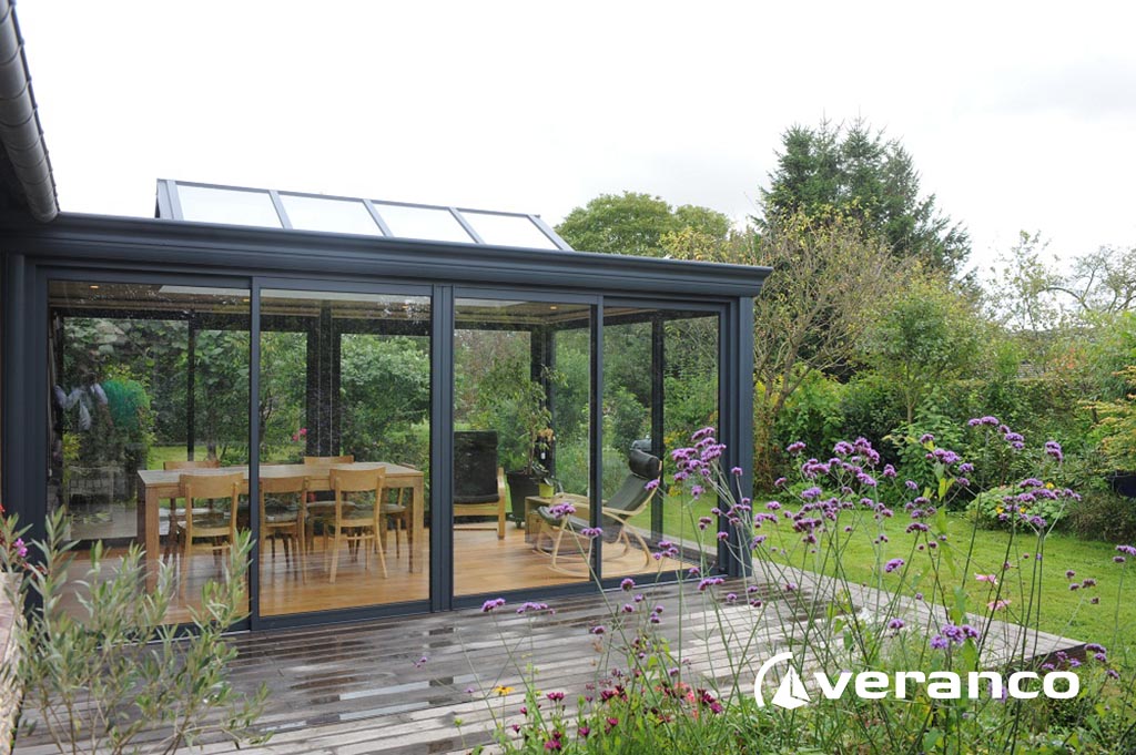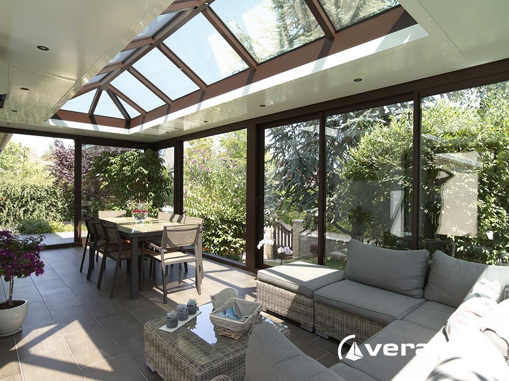- Cette véranda peut se coupler habilement avec une pergola à toiture plate ou à lames orientables