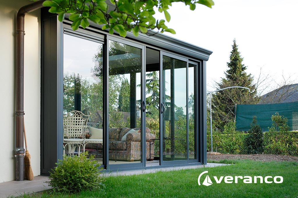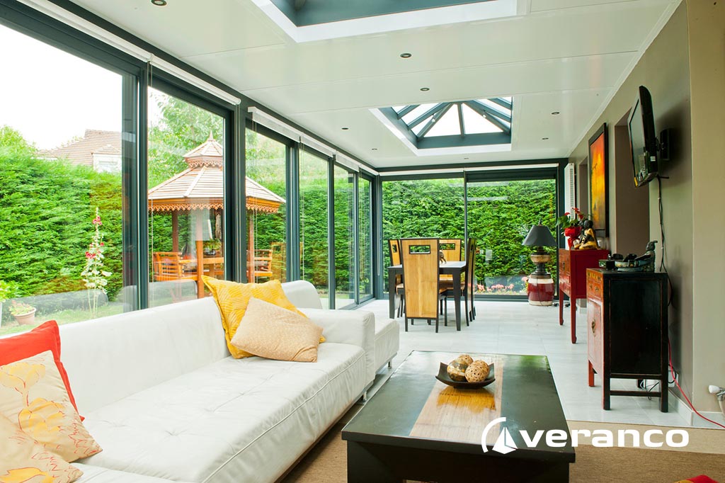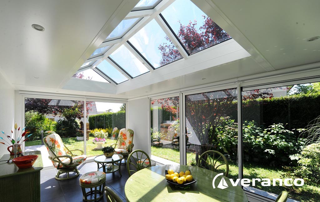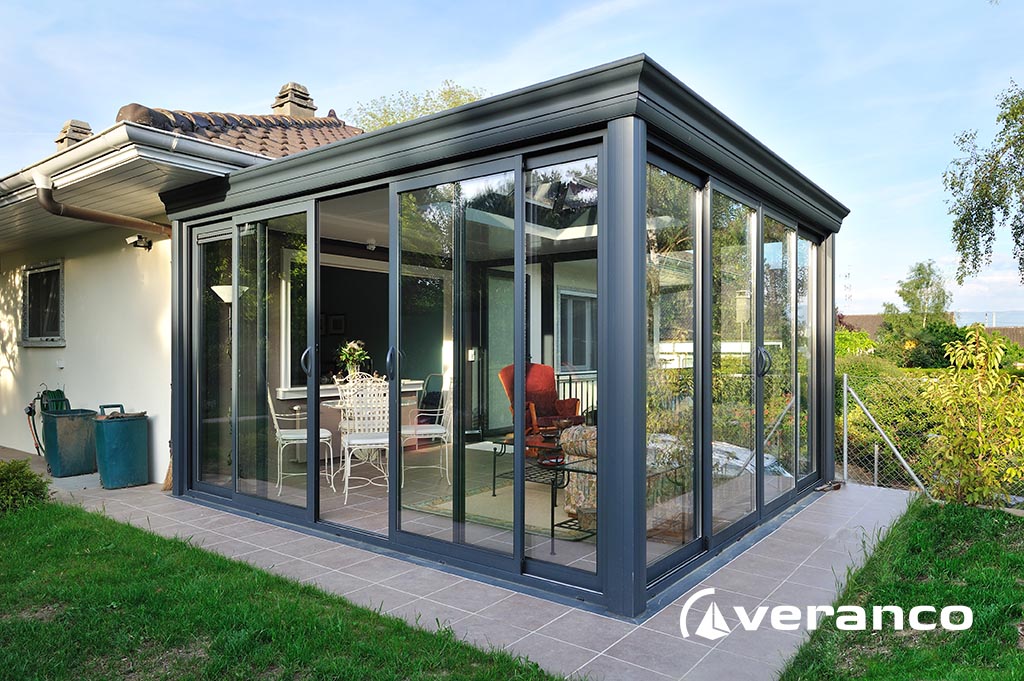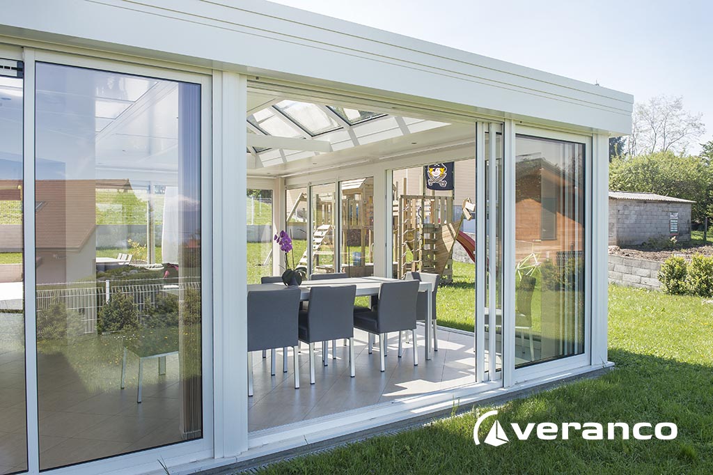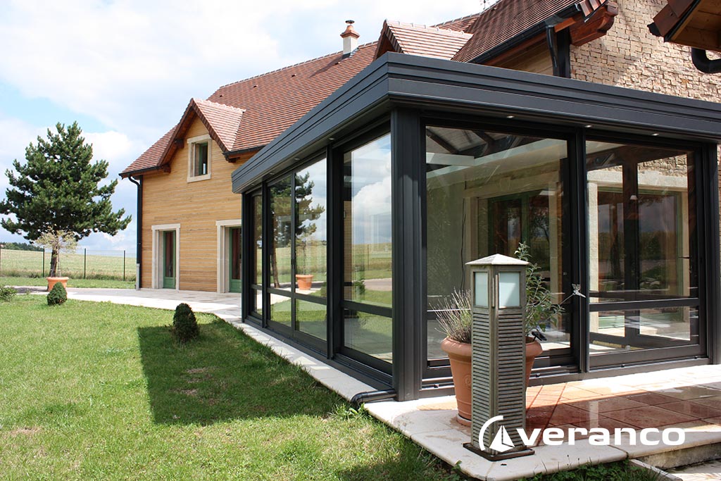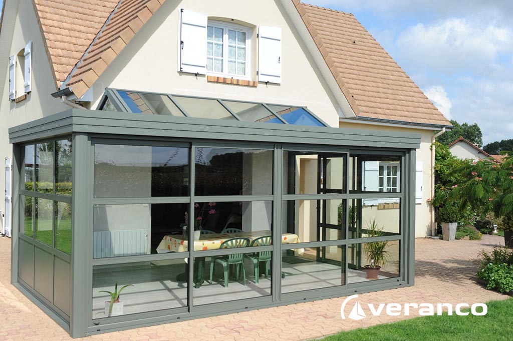 - Cette véranda peut se coupler habilement avec une pergola à toiture plate ou à lames orientables