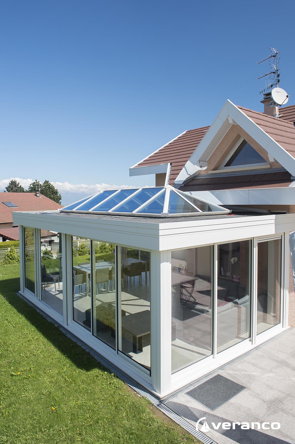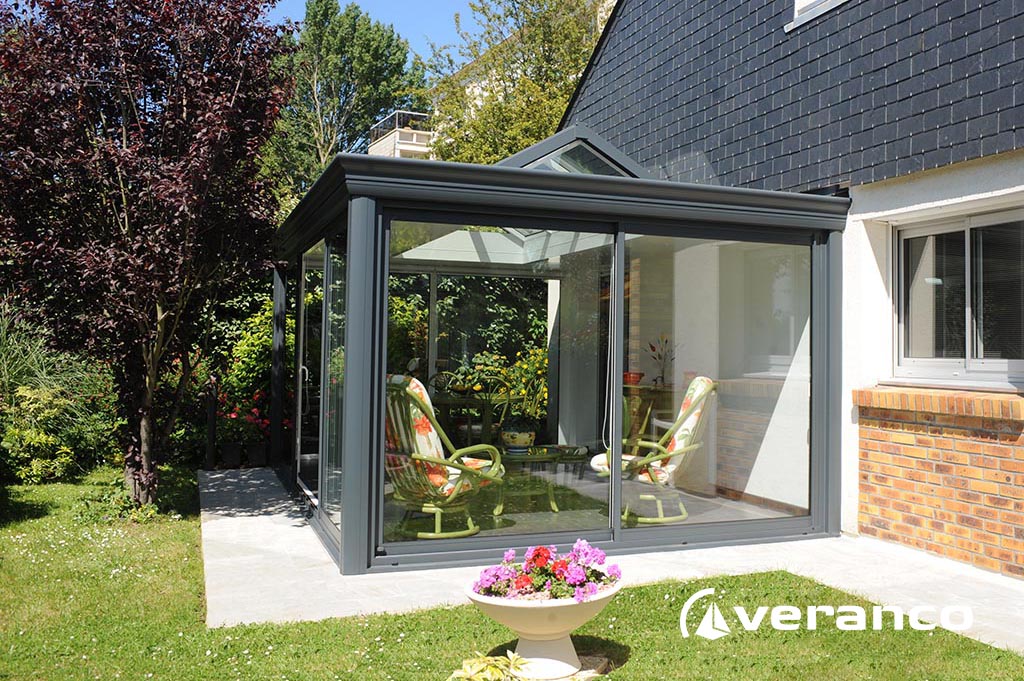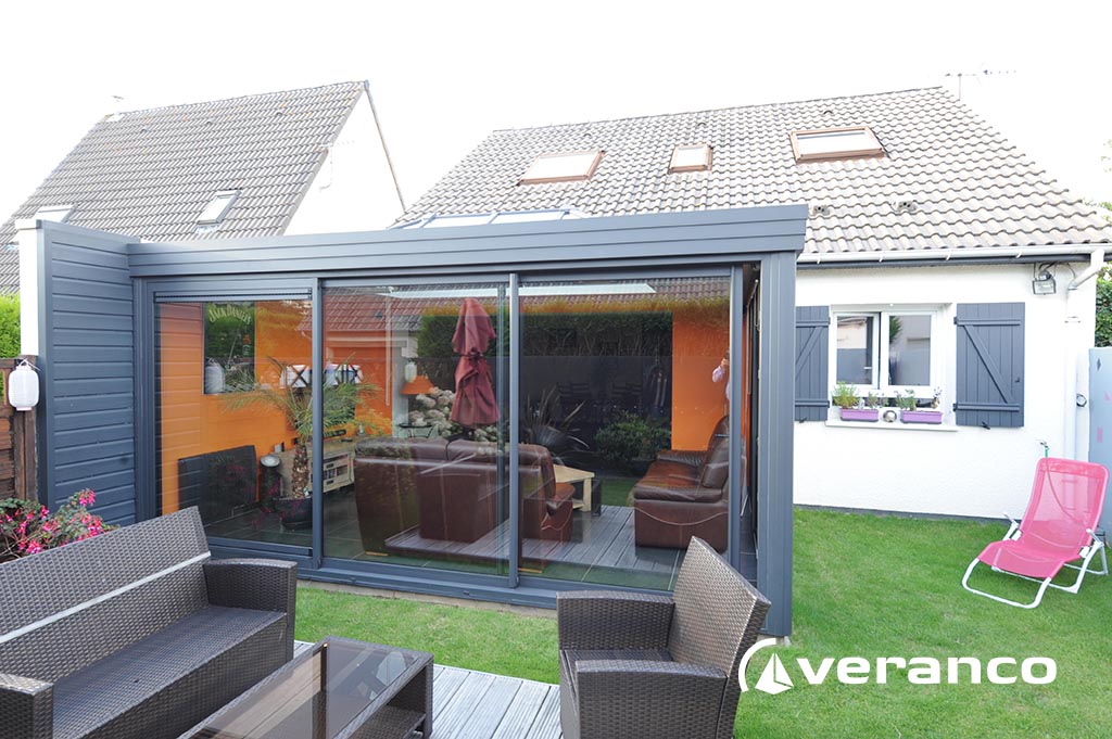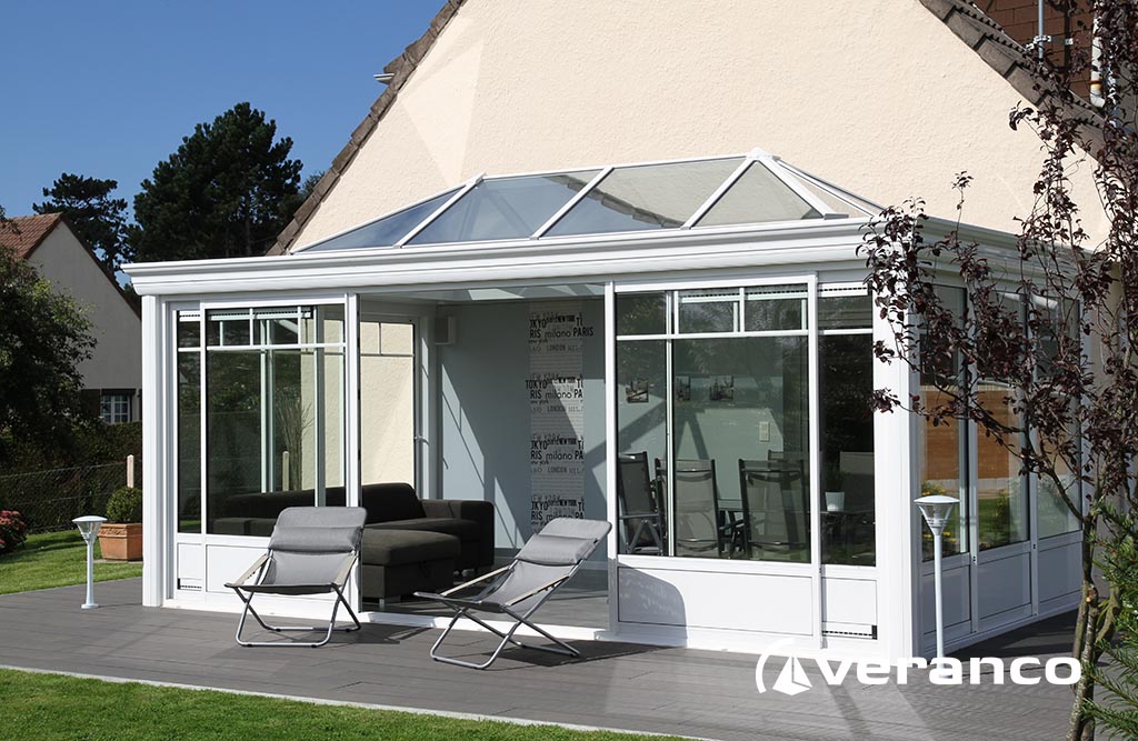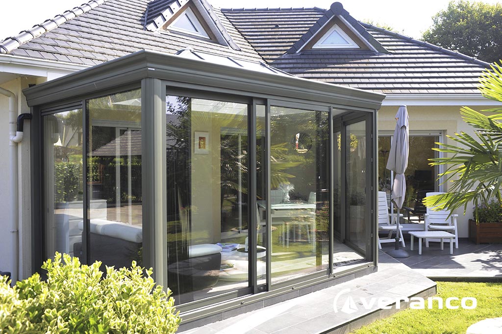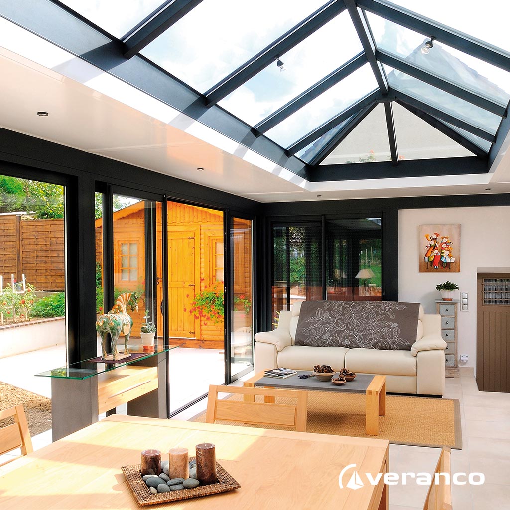 - Cette véranda peut se coupler habilement avec une pergola à toiture plate ou à lames orientables