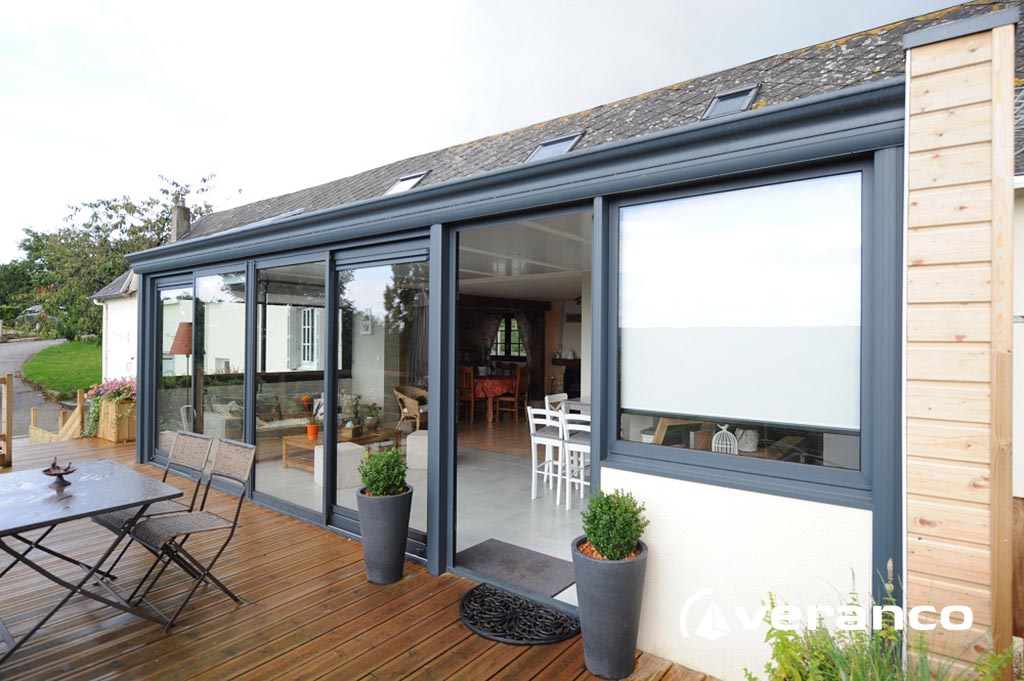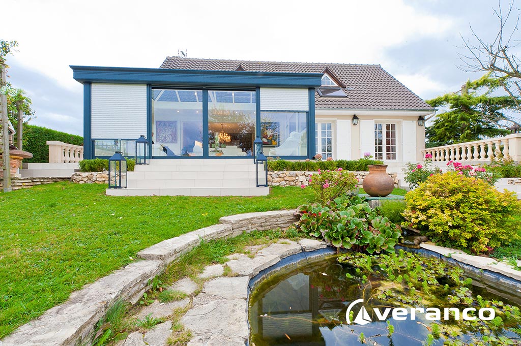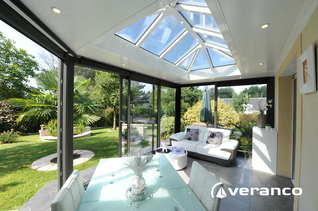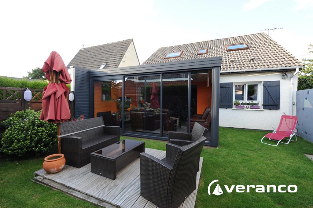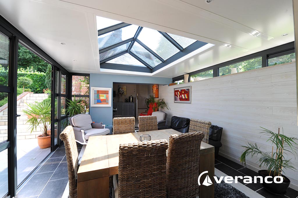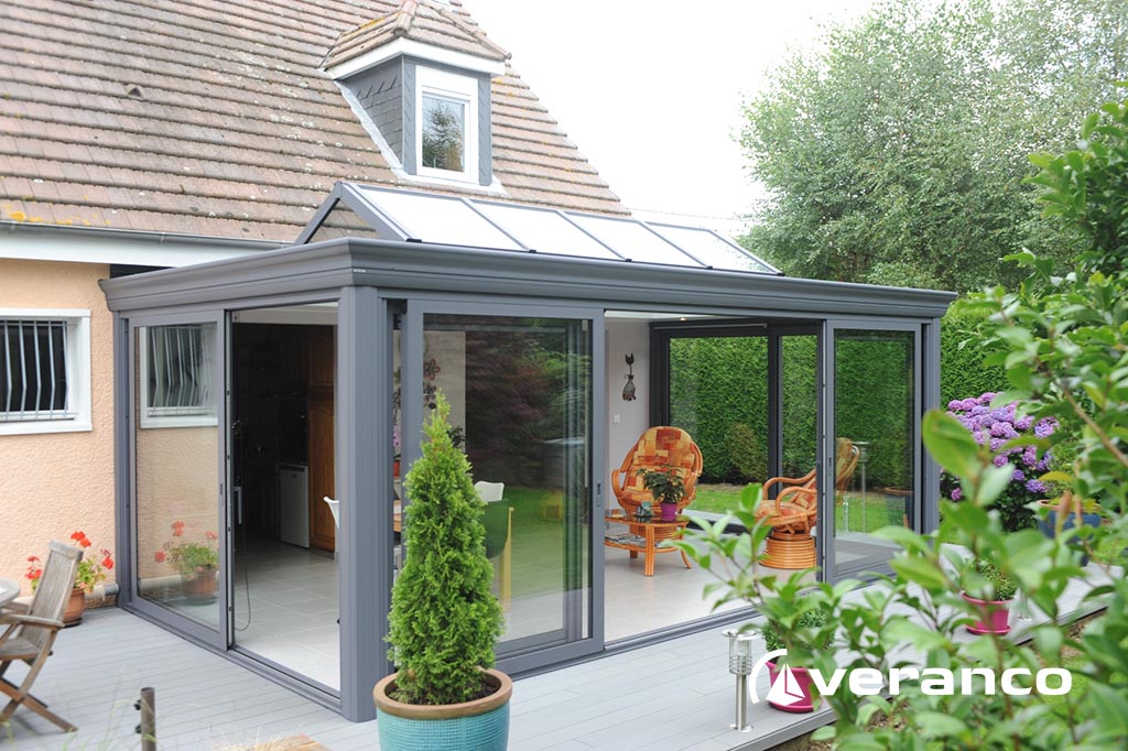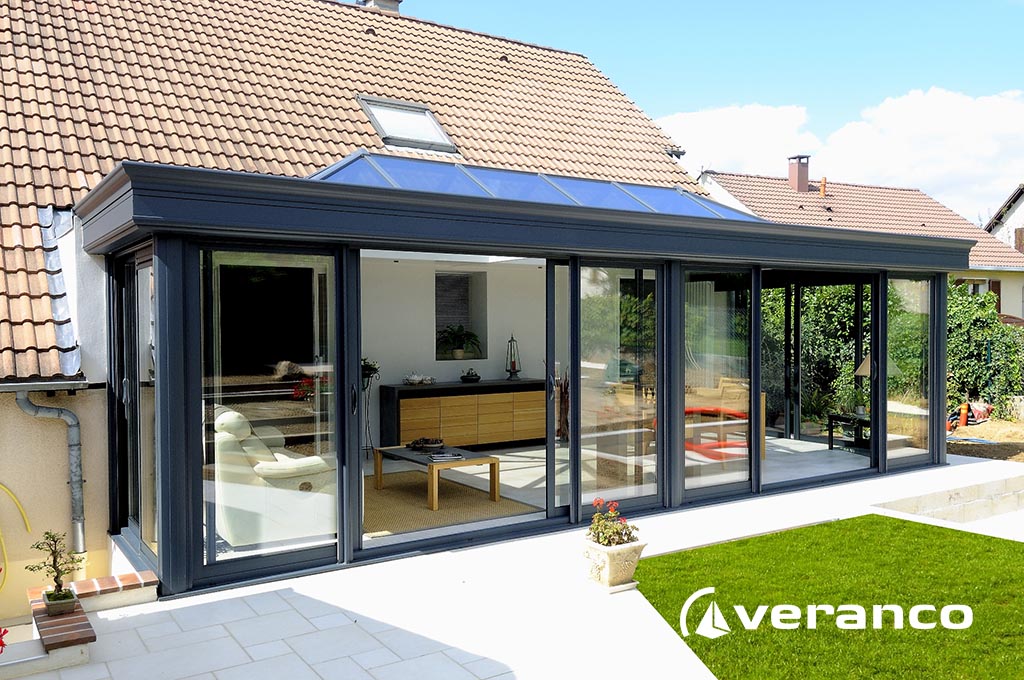 - Cette véranda peut se coupler habilement avec une pergola à toiture plate ou à lames orientables