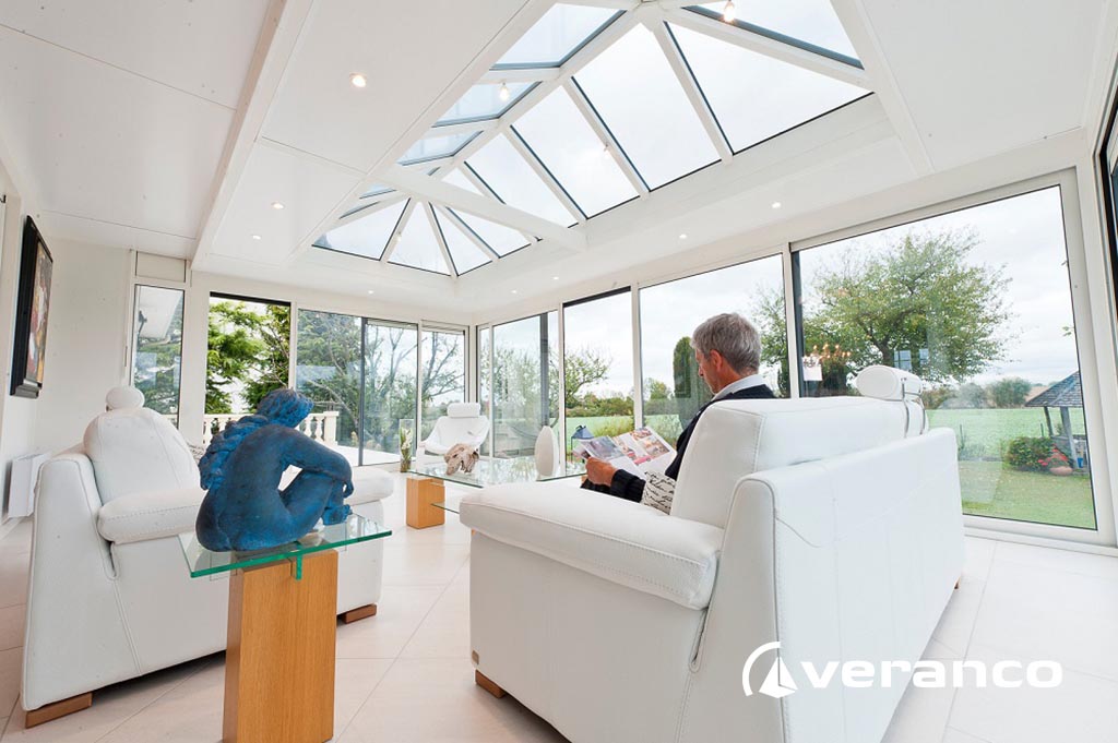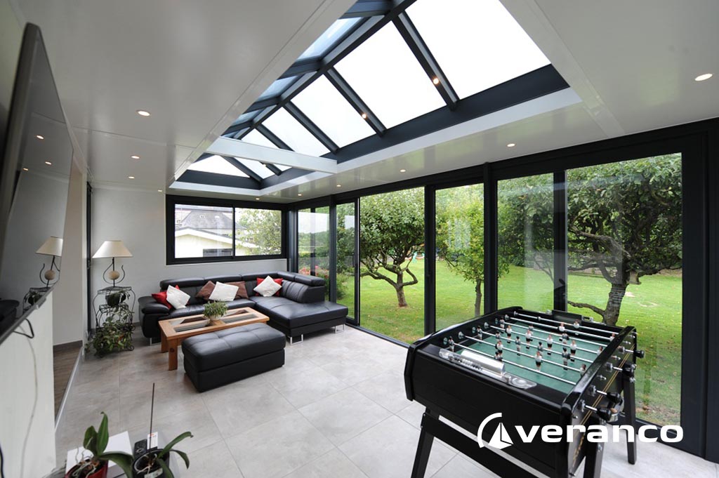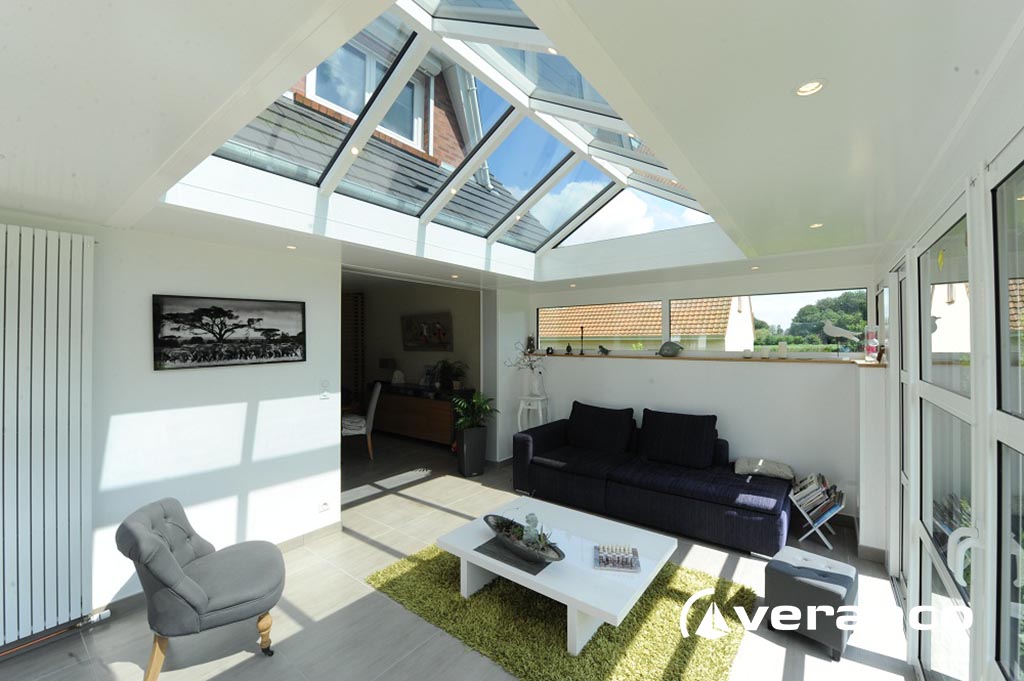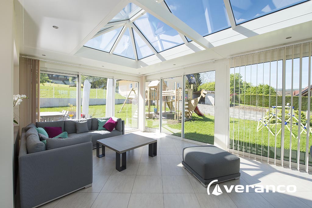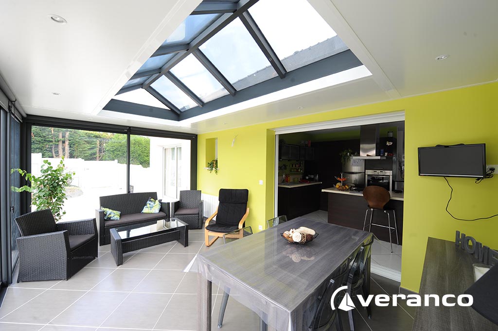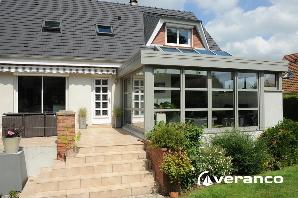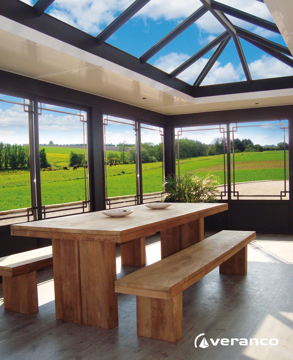 - Cette véranda peut se coupler habilement avec une pergola à toiture plate ou à lames orientables