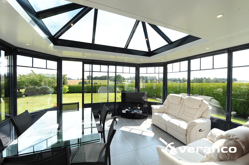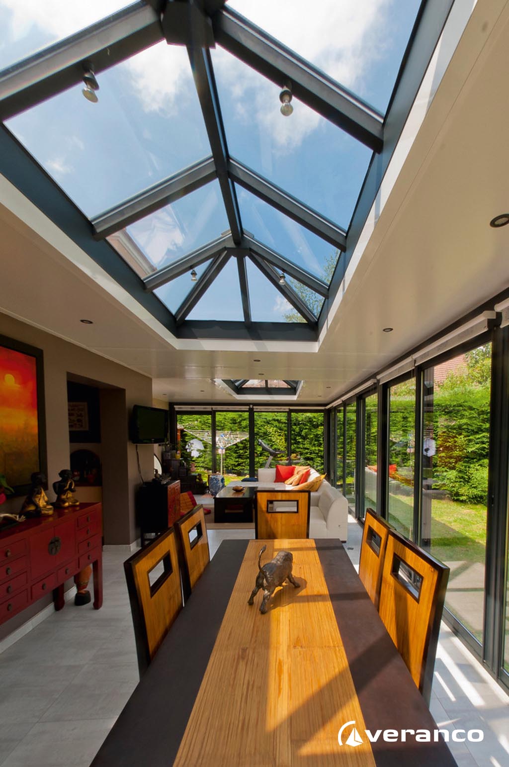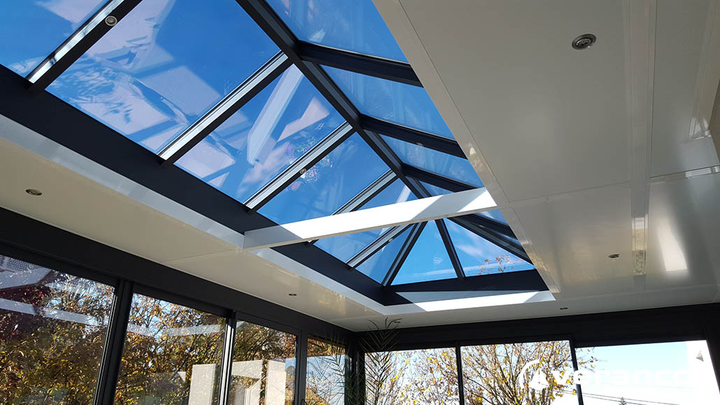 - La toiture est à rupture intégrale de pont thermique et se ferme de différentes manières (double/triple vitrage avec protection solaire "heat Mirror", panneaux isolants polycarbonate ou opaque), notre exclusivité le Panneau Isolant Liège lui confère une isolation thermique et phonique incomparable